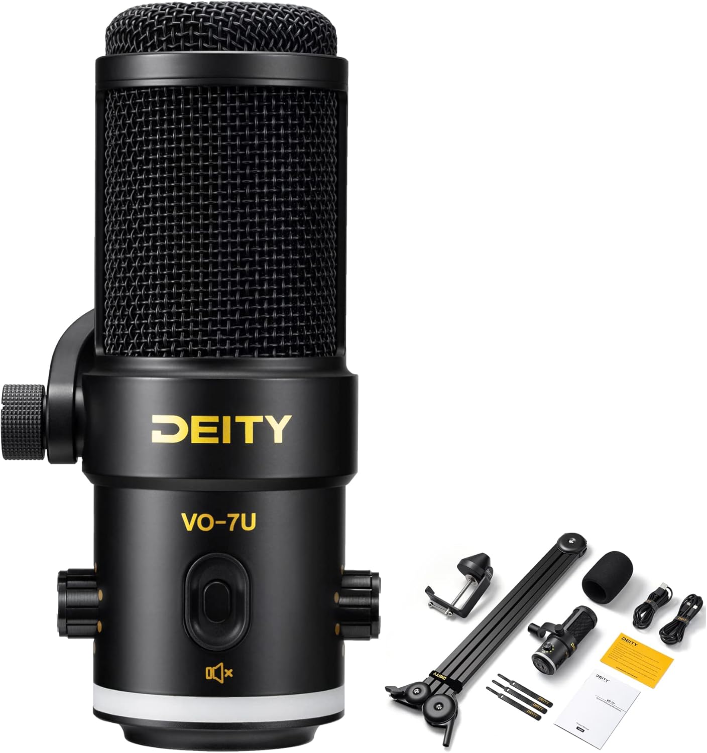 Deity VO-7U Micrófono de condensador de micrófono dinámico de metal para podcasting, grabación, videojuegos, interfaz de monitor integrada de 3.5 mm (con brazo de brazo de micrófono)