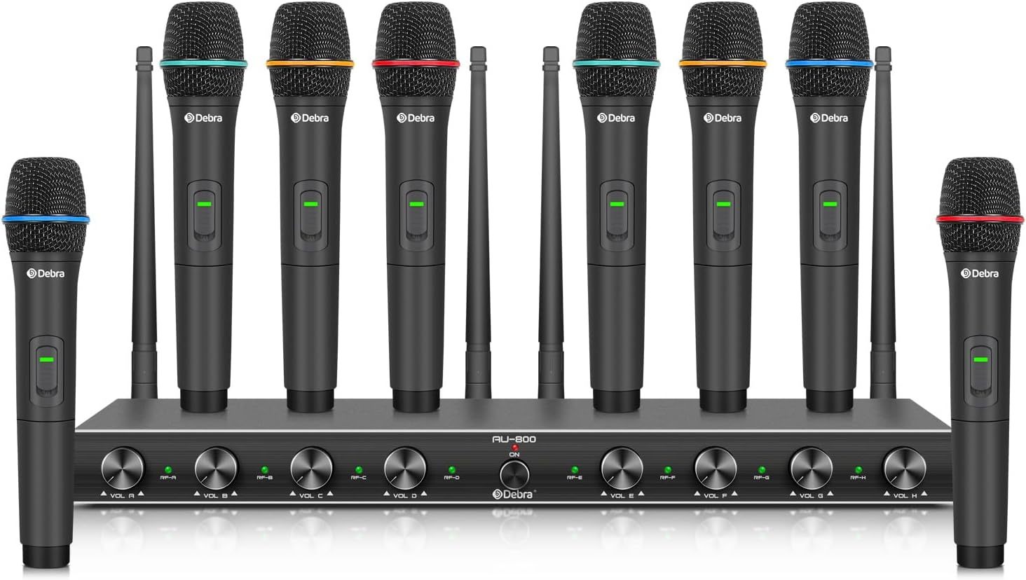 Sistema Micrófonos Inalámbricos UHF Debra, 8 Canales, 8 Mano, Receptor Metal, Sin Interferencias, para Karaoke e Iglesias